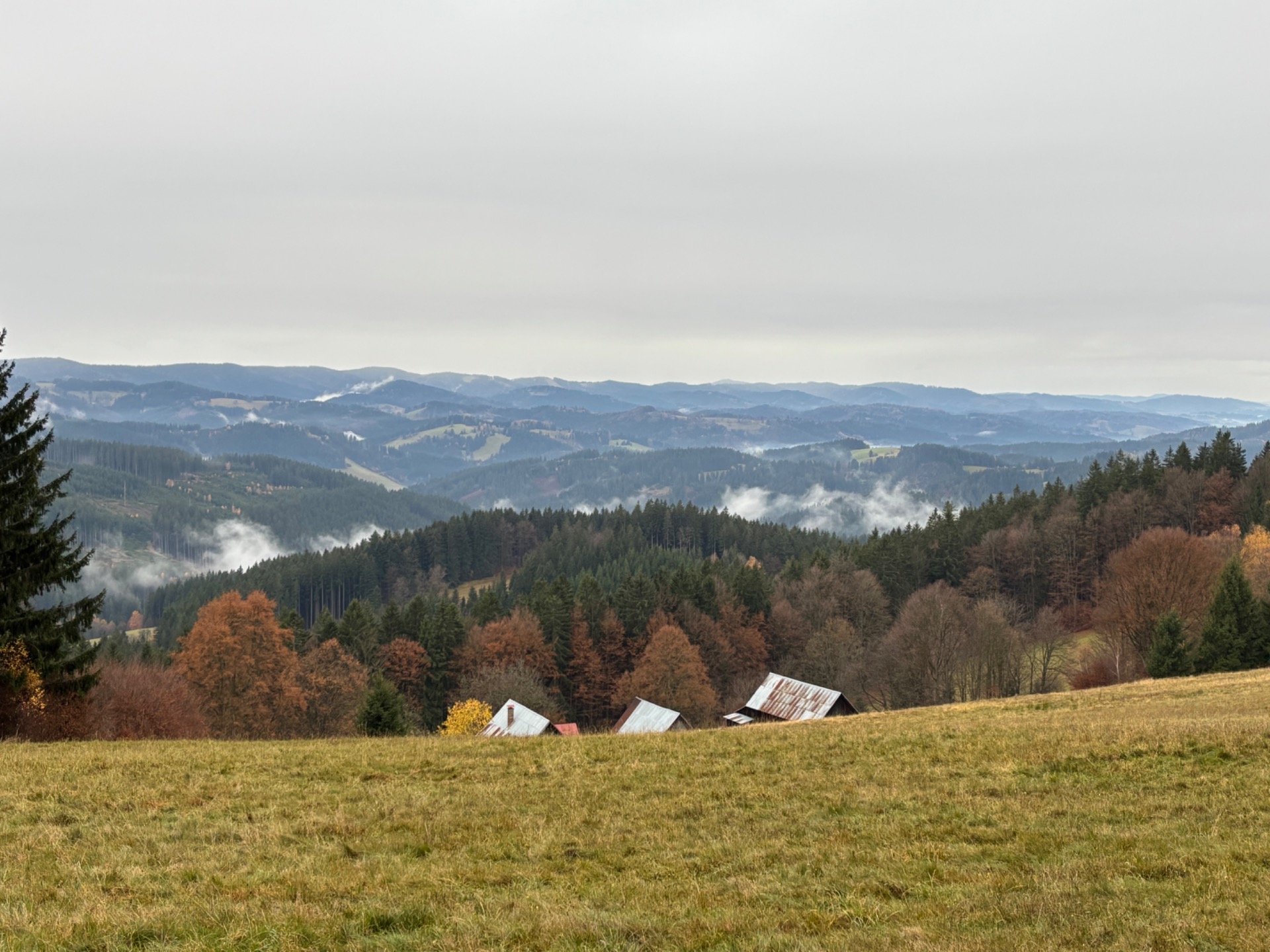 Po rychlé svačince se vydávám místo do Bečvy na Benešky. Uvidíme co mě tam čeká. Začínají se pomalu objevovat výhledy, taky přestalo na chvíli pršet. Z údolí se zvedají mlhy. Je to kouzelné. Tichou krajinou zahalenou do mlhy se nejprve nesměle rozezvučí zvuk kravských zvonců. To je trochu to, co jsem hledala. S každým dalším krokem se zvuk přibližuje. Moje nohy ale bolí až moc na to, abych atmosféru mohla plně prožít. Myslím jen na to, že se chci nejkratší cestou vydat do Karolínky.